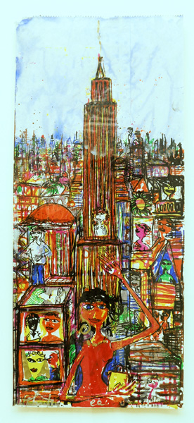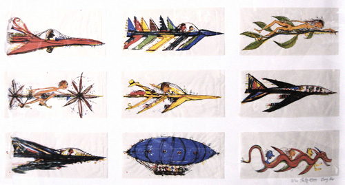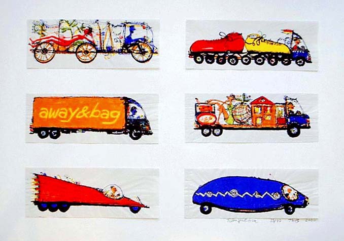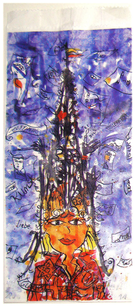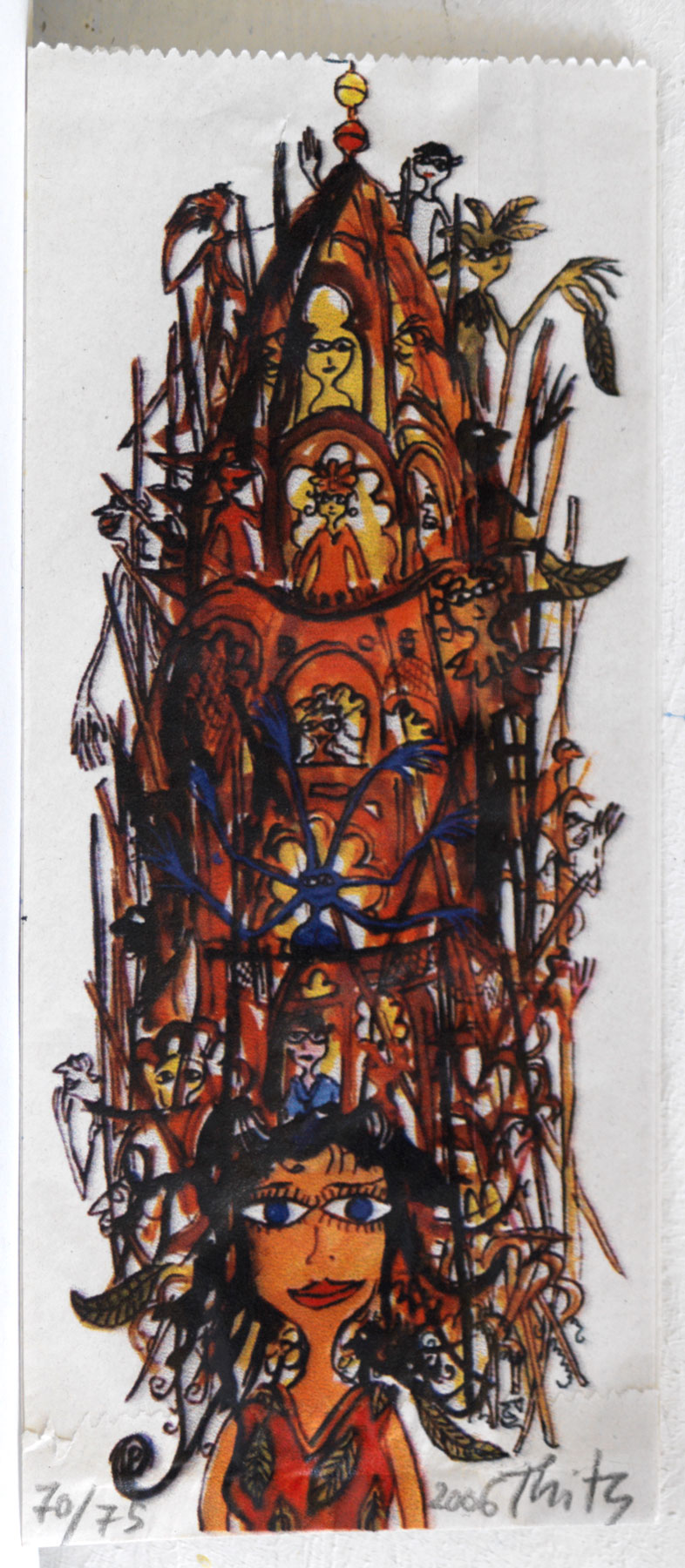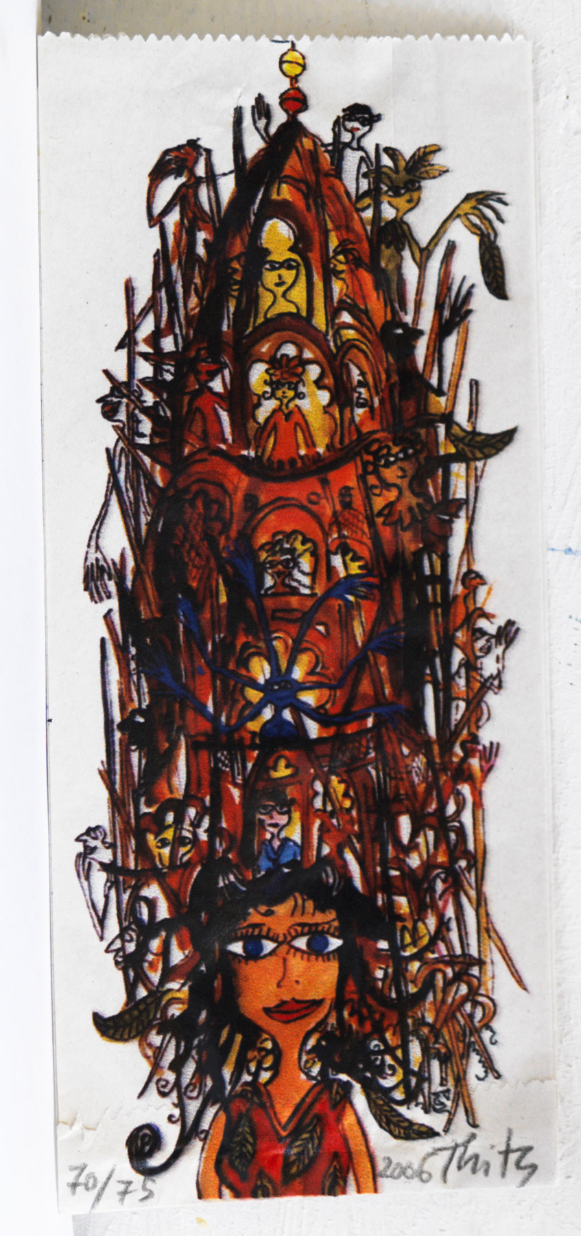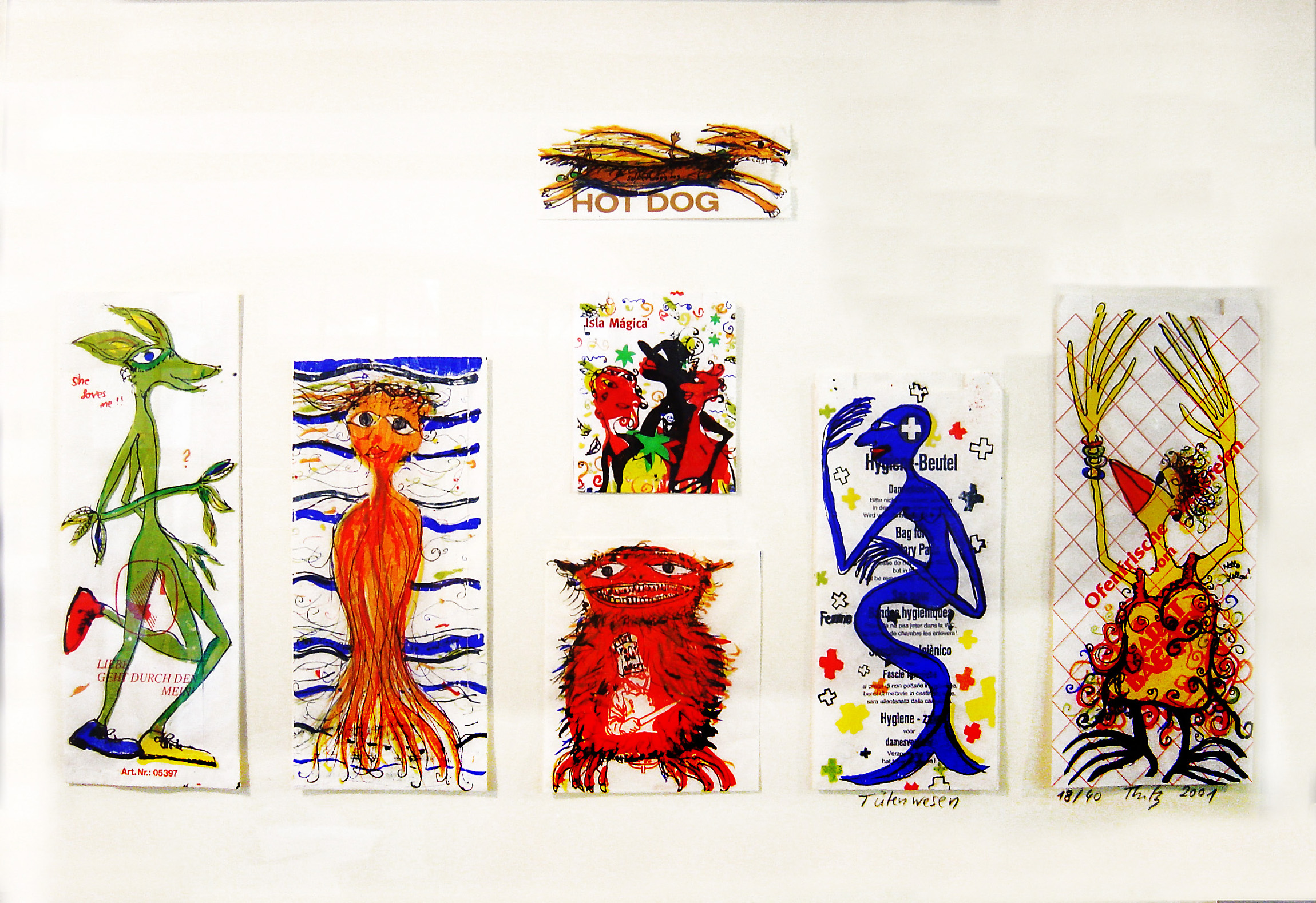 Artist's screen print with different overpaintings,( 2010-2014 ) on Hahnemühle handmade paper and bags
