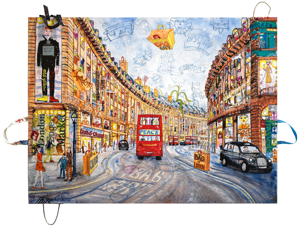 German artist THITZ puts a new spin on the tradition of the artist on the Grand Tour: he paints city scenes upon paper bags scavenged in the places he visits. The bags are opened out flat for maximum coverage, and the paintings are executed with acrylics in energetic delineations of bird's-eye views of individual landmarks.