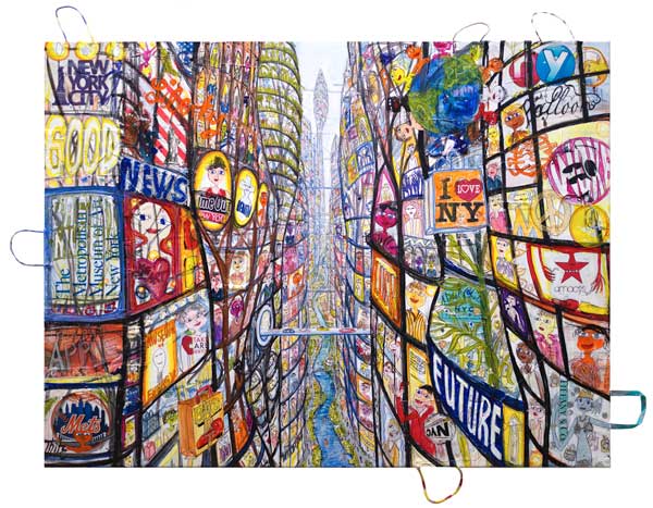 Thitz formuliert farbenfrohe Utopien. Seine Werke präsentieren ein wohlgelauntes Heute und ein schwungvoll gezeichnetes Morgen. Auf seinen ausgedehnten Reisen sammelt er Attribute urbaner Kulturen – und was bildet eine Zivilisation besser ab als Einkaufstüten? Thitz recycelt sie vorbildlich in seine Stadtlandschaften, und ihre Laschen verwandeln sich in Reißleinen für den Sprung aus der nüchternen Realität in euphorische Dimensionen. Für Skepsis ist hier kein Platz.