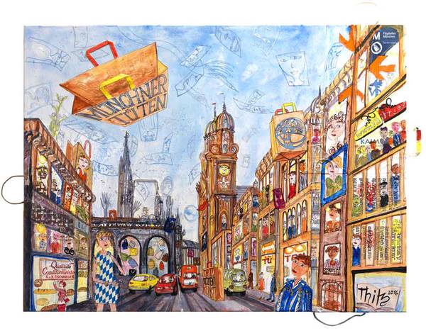 Auf jeden Fall ist sie aus unserer Gesellschaft nicht mehr wegzudenken. Thitz verwendet sie in mannigfacher Form. Sie erscheint in seinem Schaffen als Objekt wie auch als Maluntergrund seiner Bilder. Ist die Tüte, welche er als Material verwendet, einerseits Symbol einer zivilisatorischen Gesellschaft, so ist die Metropole andererseits der thematische Inhalt seiner Bilder. Kein anderer Raum weist eine derartige Komplexität auf wie die Metropole. Leute, Gebäude, Strassen, Verkehrsmittel, Reklame etc. sind Fragmente dieses von Menschen geschaffenen Raumes. So vielschichtig sich dieser Raum präsentiert, so vielschichtig im wahrsten Sinn des Wortes versteht es Thitz, ihn wiederzugeben.