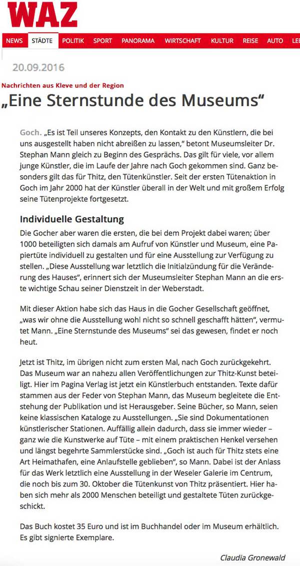 (*) Der neue Thitz Katalog THITZ TÜTEN KUNST 2016 Umfassende Publikation von Thitz Werken und Projekten. Hardcover mit, aus dem Umschlag gestanzten, Tütengriffen. 250 Seiten mit Texten in Deutsch und Englisch von | Presentation of the new THITZ catalogue , 250 pages, hardcover with bag-handles, Texts english|german from: