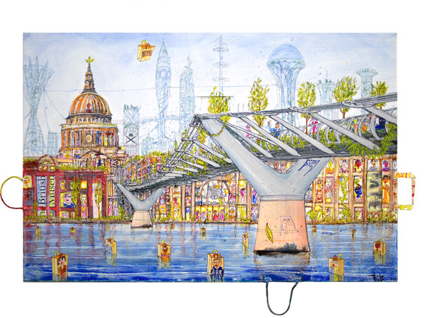 Steden als London, Parijs, Amsterdam, Brugge en vele andere wereldsteden vormen een belangrijke inspiratiebron. Reclames, licht, architectuur en menselijke ontmoetingen komen samen in schilderijen die meerdere lagen tegelijk tonen. Wie langer kijkt, ontdekt steeds nieuwe details en verhalen. In al zijn werk klinkt een optimistische visie door op een vreedzame en duurzame wereld.