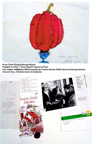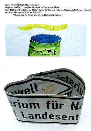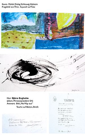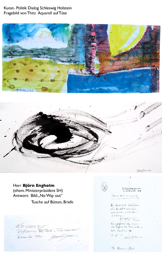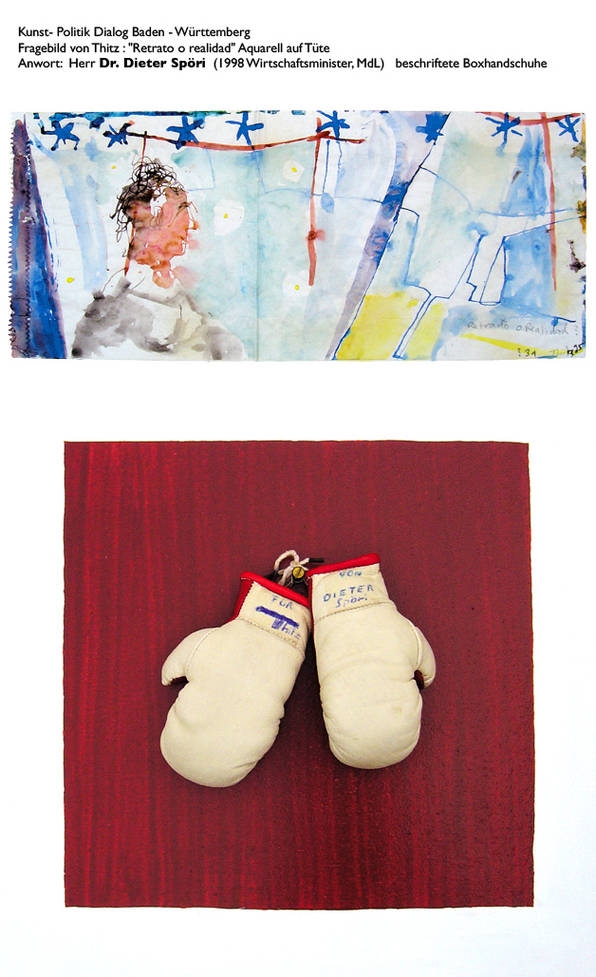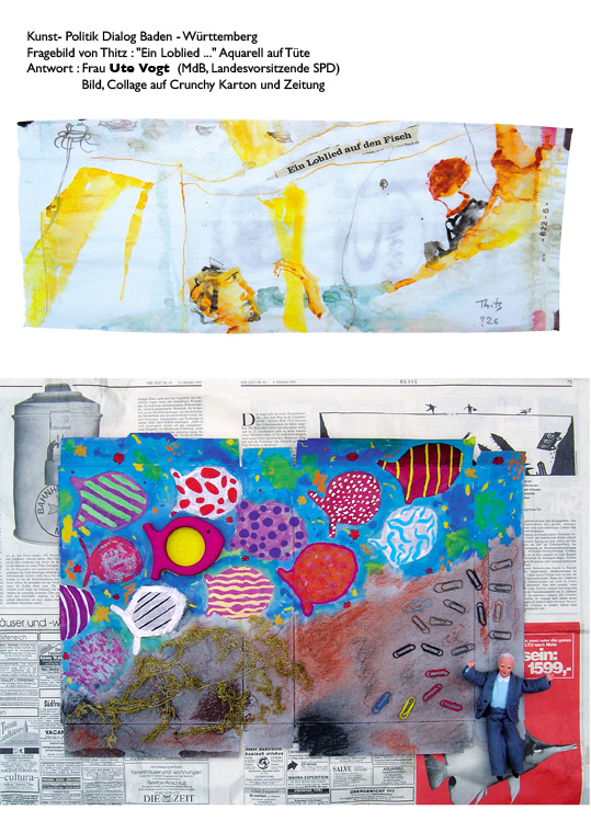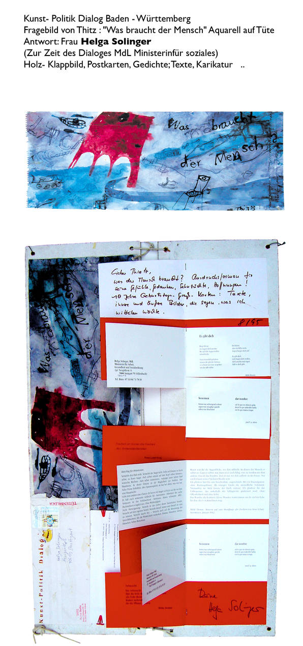 Den Dialog zwischen Kunst und Politik wollte der Künstler Thitz forcieren und verschickte "Fragebilder" ("Aquarelle auf Tüten, als Frage gemalt") an Minister, Bundes- und Landtagsabgeordnete. Diese sollten ihre Antworten in künstlerische Form fassen, und 18 Adressaten entwickelten ungeahnte Kreativität: Der SPD-Fraktionschef im Stuttgarter Landtag Ulrich Maurer verfasste z.b. ein Gedicht, Ministerin Helga Solinger bedachte den "lieben Thitz" mit einem Klappbild aus Postkarten, Lyrik und Karikaturen, die Bundestagsabgeordnete Nicolette Kressl malte ein Bild, und mit ihrem Kollegen Peter Conradi geht der Dialog bereits in die dritte Runde"