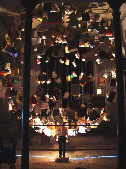 Das Licht fällt durch die ”Fenster” in die Tüte. Kleine papierne Fenster mit Symbolen und Texten von Religionen und Weltanschauungen aus der ganzen Welt - aus Büchern, Zeitschriften, aus dem Internet und von vielen Reisen. Wir finden Textfragmente und Fotos von Karl Marx bis Robert Rauschenberg vom Dalai Lama bis zu den Göttern der Mayas. Aus allen großen Religionen über alle Religionen so z.B. eine Koranseite auf hebräisch oder die Meinung des Dalai Lama zum Christentum.
