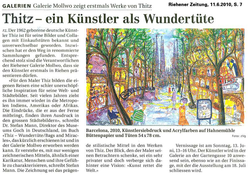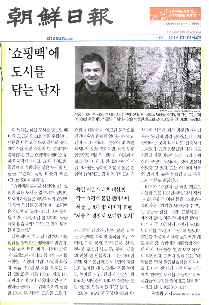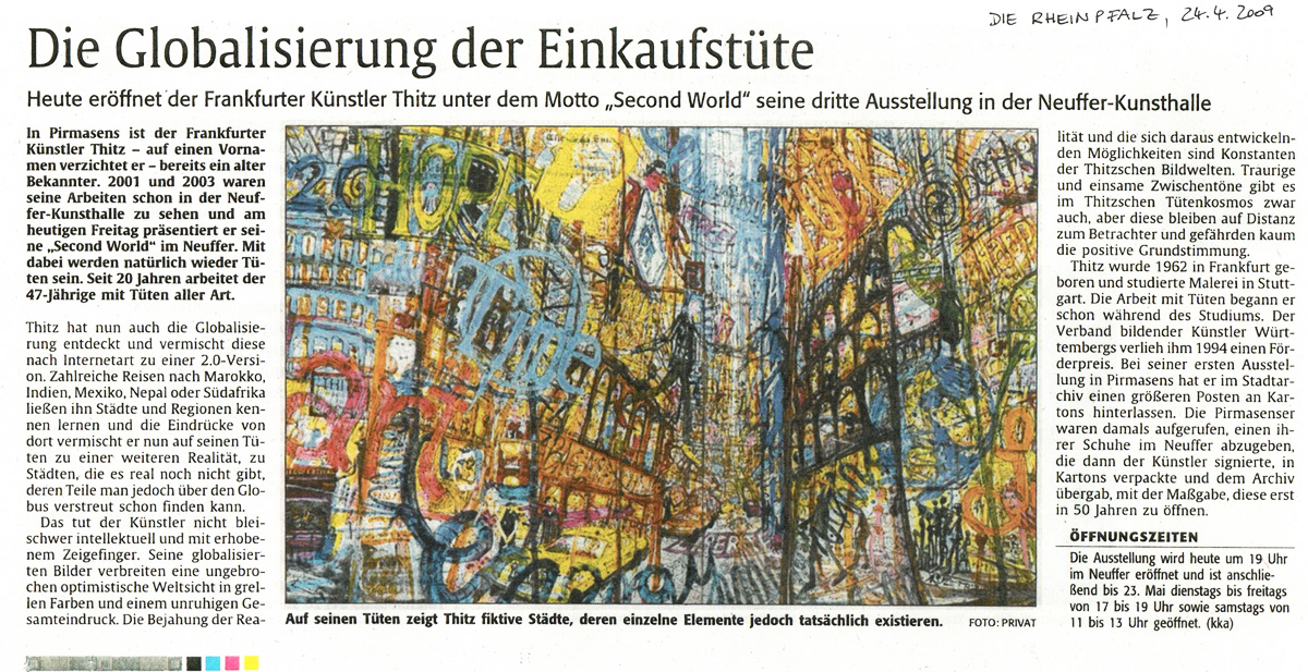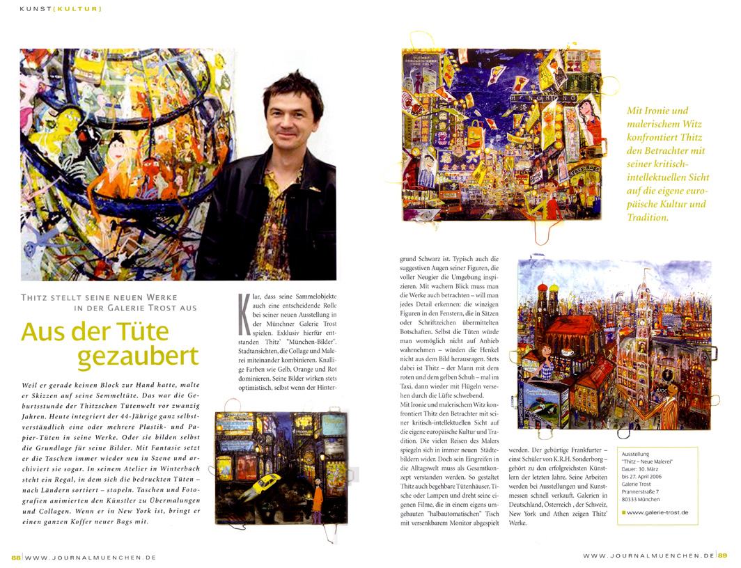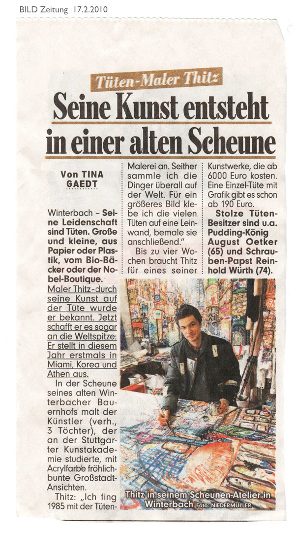 Man kennt seine Bilder auf der ganzen Welt und er verdient sein Geld, ob Sie es glauben oder nicht, tatsächlich mit Tüten . Er sammelt Tüten überall sie sind ein Notizblock und Inspiration er sammelt sie und klebt sie in seine Bilder. So entstehen bizarre Stadtlandschaften wiedererkennbar und doch außergewöhnlich. Natürlich auf einer Tüte … seine Lieblingsstadt bleibt jedoch New York. Die Werbetafeln am Timesquare haben es ihm angetan. Dort findet man sogar die typischen Thitz Schuhe..