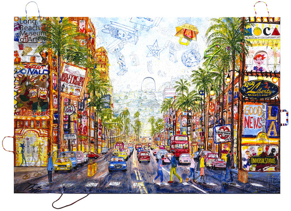 "Thitz ist ein Meister der belebten Stadtlandschaft. New York, Tokyo, Milano, er hat die großen Metropolen alle gemalt, in Acryl und Tusche über Tüten auf Leinwand, die am Bildrand überstehenden Henkel als Erkennungszeichen.Die Autos werden weniger. Damit geht er dem Trend um Längen voran, Thitz vor Greta. Während andere noch streiten, wie es weitergehen soll, kann er sich in olympischer Manier gelassen zurücklehnen und zum futuristischen Klassiker reifen. Lange war es laut, bunt, vital, hektisch und roch nach großen Kreuzungen. Seit einigen Jahren ist es ruhiger geworden: Thitz begrünt seine Welt, überzieht seine Städte mit wuchernden Wäldern oder setzt sie unter Wasser. So sehen wir, in Thitz‘ Werken gespiegelt, die Zukunft unseres Planeten durch die Teleskope einer Zeitmaschine. Berlin und New York sind nach wie vor aktivistisch, da grünt es, dass die Stengel krachen, aber an den alten Metropolen scheint die Zeit spurlos vorübergezogen zu sein.Paris liegt unter silbrig schimmerndem Himmel. In Venedig treiben gemächlich Tüten den Canal Grande hinab in Richtung Dougana - plötzlich scheint es, als hätten Canaletto und Thitz nebeneinander an den Staffeleien gesessen und sich gegenseitig über die Schulter geguckt. Venedig!? Sollte das nicht versinken? Nein, auch in der Thitz-Zeit ragt die Serenissima völlig unbeeindruckt aus der Lagune. Und auch sonst ist alles gut ausgegangen – am Amazonas wuchert der Dschungel und selbst die Liebhaber vitaler kapitalistischer Optik kommen noch auf ihre Kosten: in Hongkong - aber nur zu Fuß!” Dr. Jörk Rothamel zur Utopian Civilizazions Serie 2020